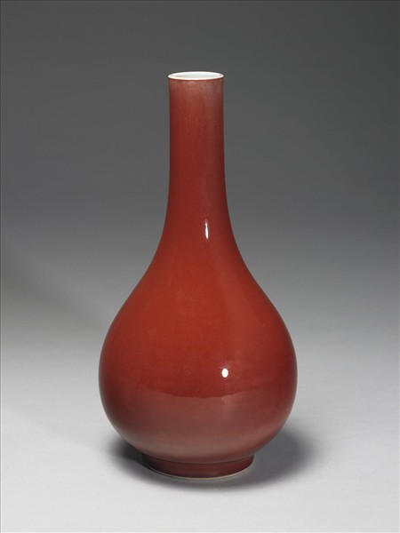 小口,細長頸,斜肩,碩腹,圈足。器身施霽紅釉,明豔勻亮,口、器裡與底白釉,全器光素無紋飾。圈足露白胎,底青花書「大清雍正年製」雙行六字楷款,外加雙圈。