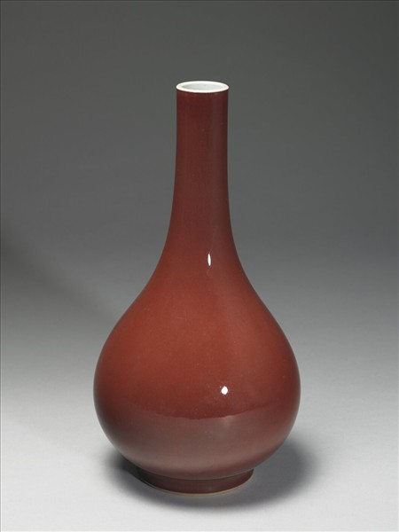 小口,細長頸,斜肩,碩腹,圈足。器身施霽紅釉,明豔勻亮,口、器裡與底白釉,全器光素無紋飾。圈足露白胎,底青花書「大清雍正年製」雙行六字楷款,外加雙圈。