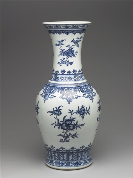 侈口,長頸,鼓肩,漸下斂,近足處外撇,平底內凹成足。外壁白地青花繪圖樣為飾。全器裝飾可分為頸、腹兩大部分,兩部分皆以等距出現的折枝花果為主要紋飾,折枝花果上下則飾以較為繁密的帶狀紋飾,如回紋、卷枝花、卷草、如意雲頭、門字形蓮瓣等。其中頸部的主飾為折枝花,腹外壁的主飾為折枝石榴、桃實、荔枝等,這些折枝花果的下方主枝均見靈芝生長,可說是將延年長壽的吉祥意涵附加於折枝花果中。底部滿釉,白地青花書「大清雍正年製」三行六字篆款。