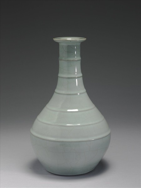 撇口,長頸,溜肩,斂腹,矮圈足。全器施青釉,形仿宋代官釉,釉表有粗疏開片紋,頸部至肩部裝飾等距相間的弦紋六道。足底周緣露胎,加塗黑褐色鐵汁,呈鐵黑色,底以青花書「大清雍正年製」三行六字篆書款。