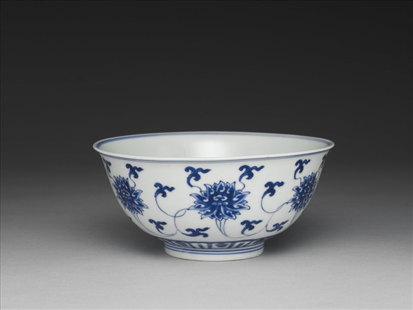 碗,微撇口,深弧壁,平底,圈足。外壁以青花繪製轉枝番蓮花紋,腹部下緣飾蓮瓣紋一圈,內外口沿及圈足外壁各繪有兩道弦紋,內底繪單朵番蓮花,外加雙圈。圈足底緣露胎,胎色潔白,外底以青花書「大清康熙年製」六字雙行楷款,外加雙圈。