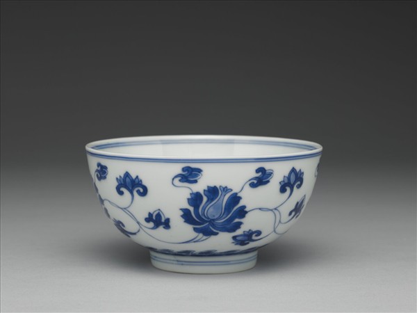 碗,敞口,深弧壁,平底,圈足。外壁以青花繪製轉枝番蓮花紋,腹部下緣飾火燄紋一圈,內外口沿及圈足外壁各繪有兩道弦紋,內底繪單朵番蓮花,外加雙圈。圈足底緣露胎,胎色潔白,外底以青花書「大清康熙年製」六字雙行楷款,外加雙圈。