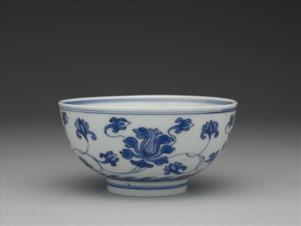 碗,敞口,深弧壁,平底,圈足。外壁以青花繪製轉枝番蓮花紋,腹部下緣飾火燄紋一圈,內外口沿及圈足外壁各繪有兩道弦紋,內底繪單朵番蓮花,外加雙圈。圈足底緣露胎,胎色潔白,外底以青花書「大清康熙年製」六字雙行楷款,外加雙圈。器內有使用痕。