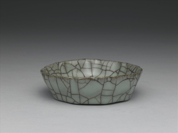 敞口洗,口作九瓣花形,深直壁略斂,平底,外底略內凹。器內外滿施青釉,釉色泛青,大片冰裂紋滿覆器內外。底外滿釉,見有大致作等距分佈的支釘痕。