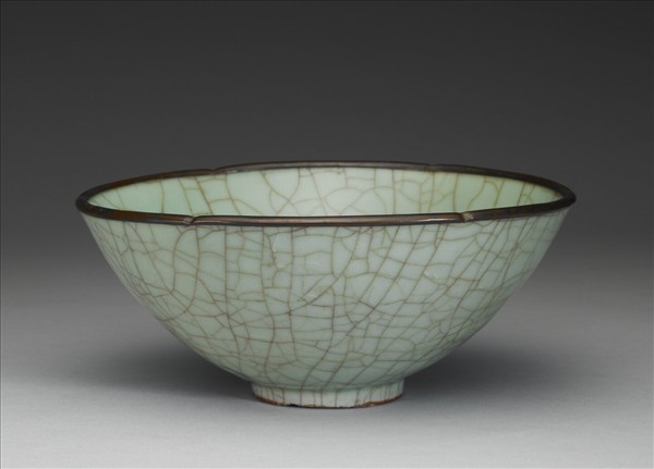 花口碗,口緣銅釦,深弧壁下斂,圈足。器內外壁施青釉,釉透而泛翠青,並滿布開片。足緣露胎一圈,塗褐色汁,足內滿釉無款識。