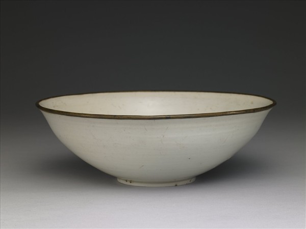 敞口大碗,深弧壁下斂,圈足。口緣銅釦,器內外壁施透明釉,見白胎色,只在圈足積釉處泛青。內外壁均光素無紋,但外壁隱約可見輪製痕。底足內滿釉無款識。