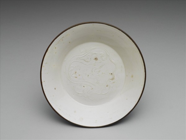 敞口,口緣鑲銅釦,深斜壁下斂,折腰,平底,圈足。器內外施透明釉,呈現出潔白的胎色。外壁光素無紋,內底心釉下印花雲龍紋為飾。足滿釉,但足緣似因使用而磨損了釉層。