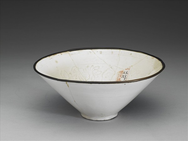 敞口笠形碗,口緣鑲銅釦,深壁下斂,圈足,外壁多處裂痕。器內外壁施透明釉,呈色白中略泛黃。外壁光素無紋,印花荷花花葉為飾。足緣露胎一圈,足內滿釉無款識。