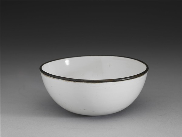 敞口碗,口緣鑲銅釦,深弧壁下斂。器內外壁施透明釉,呈色潔白。外壁光素無紋,內壁釉下印花折枝花葉為飾。碗內壁見有支釘痕,底外著地處作圓形無釉露胎區。