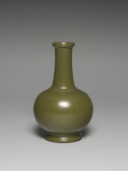 直口,口沿凸起一道唇邊,豎邊,長頸,圓碩腹,矮圈足略外撇。全器施茶葉末釉,呈橄欖綠色,釉面光滑。圈足底緣呈褐色,底施茶葉末釉,模印「大清乾隆年製」六字三行篆書款。