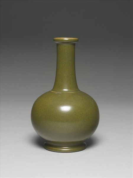 直口,口沿凸起一道唇邊,豎邊,長頸,圓碩腹,矮圈足略外撇。全器施茶葉末釉,呈橄欖綠色,釉面光滑,口沿及頸腹交接處釉薄呈黃棕色。圈足底緣呈黑色,底施茶葉末釉,模印「大清乾隆年製」六字三行篆書款。