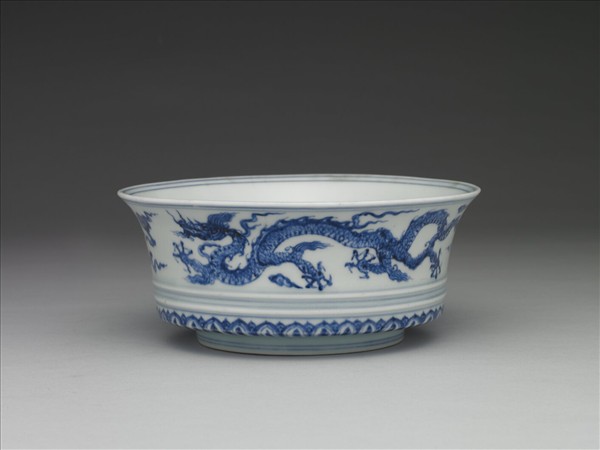 侈口,深壁,平底,底邊內折(又稱折腰碗),矮圈足。此為合碗之一,惟缺蓋。 器壁畫雙龍雲紋,底邊蓮瓣紋一周,因底邊內折,故蓮瓣僅見上半,內壁純白無紋,碗口及足邊紋飾間共加飾青線十六道。青釉勻深,深處多帶褐綠色斑,釉面大小氣泡密佈。圈足及底邊凸弦紋積釉處白釉泛青。瓷胎勻厚,碗內底微凹,外底心微凸,胎質細膩潔白。內底書「大明宣德年製」二行六字楷款,外加雙圈。