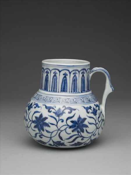 青花花澆。器口微侈,直頸,碩腹,如意形把連接頸腹,平底內凹成足。全器以釉下鈷藍釉彩繪,釉色深藍。器頸部裝飾蓮瓣紋,頸腹間飾凸棱一圈,凸棱下一圈回紋,腹外壁繪飾纏枝花葉,等距裝飾的花卉大朵盛開,其上並見有「大明宣德年製」橫向單行六字楷款,腹外壁近底處卷草紋一圈。底露胎。這一種器形也見於伊斯蘭金屬器,或是明宣德時與伊斯蘭交流的作品。