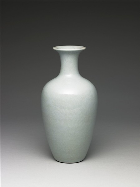 撇口,長頸,斜肩,歛腹,矮圈足。全器施仿汝青瓷釉,器表釉面滿佈淡褐色細密開片紋。圈足底緣周邊呈褐色,底以青花書「大清乾隆年製」六字三行篆書款。