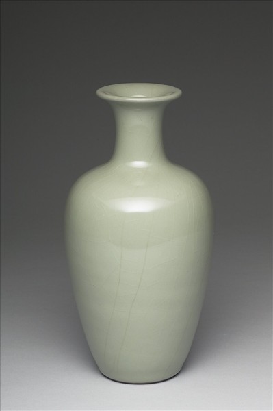 撇口,長頸,斜肩,歛腹,矮圈足。全器施仿汝青瓷釉,器表釉面滿佈淡褐色細密開片紋。圈足底緣周邊呈褐色,底以青花書「大清乾隆年製」六字三行篆書款。