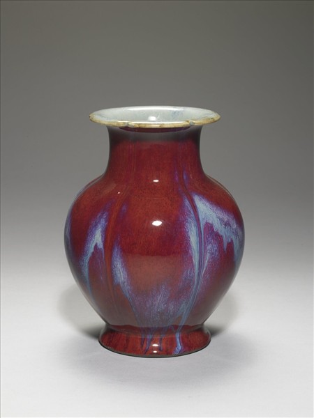圓口折沿,折沿作六瓣花形,短直頸,碩腹下斂,撇足。通體施鈞紅釉,呈紅、靛、紫、月白等多色深淺混雜流動窯變釉,口內與折沿則多作淺月白藍色。器底施醬釉,底心印「大清乾隆年製」六字三行篆款,圈足露胎,塗赭色汁。仿鈞窯變釉為雍正時出現的新品種,係仿鈞釉色繁衍而來,採多次施釉,燒成過程中,不同金屬元素自然結合。所產生的流動窯變釉色,一般偏紅者,稱「火焰紅」。