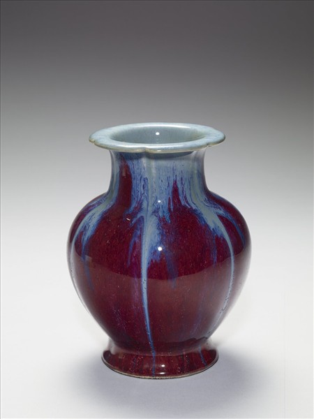 圓口折沿,折沿作六瓣花形,短直頸,碩腹下斂,撇足。通體施鈞紅釉,呈紅、靛、紫、月白等多色深淺混雜流動窯變釉,口內與折沿則多作淺月白藍色。器底施醬釉,底心印「大清乾隆年製」六字三行篆款,圈足露胎,塗赭色汁。仿鈞窯變釉為雍正時出現的新品種,係仿鈞釉色繁衍而來,採多次施釉,燒成過程中,不同金屬元素自然結合。所產生的流動窯變釉色,一般偏紅者,稱「火焰紅」。
