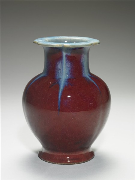 圓口折沿,折沿作六瓣花形,短直頸,碩腹下斂,撇足。通體施鈞紅釉,呈紅、靛、紫、月白等多色深淺混雜流動窯變釉,口內與折沿則多作淺月白藍色。器底施醬釉,底心印「大清乾隆年製」六字三行篆款,圈足露胎,塗赭色汁。仿鈞窯變釉為雍正時出現的新品種,係仿鈞釉色繁衍而來,採多次施釉,燒成過程中,不同金屬元素自然結合。所產生的流動窯變釉色,一般偏紅者,稱「火焰紅」。