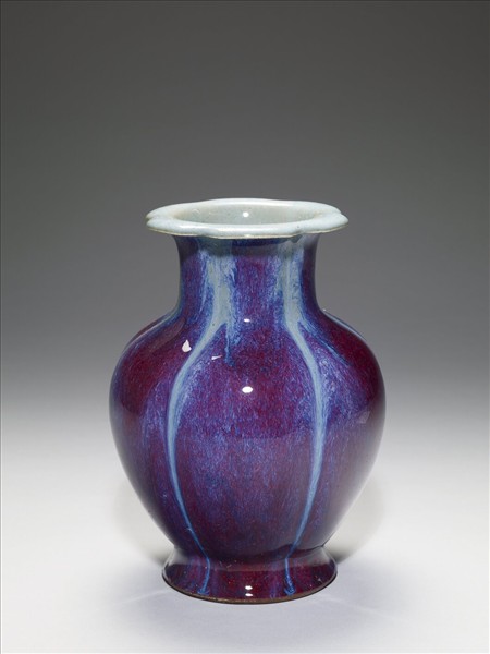 圓口折沿,折沿作六瓣花形,短直頸,碩腹下斂,撇足。通體施鈞紅釉,呈紅、靛、紫、月白等多色深淺混雜流動窯變釉,口內與折沿則多作淺月白藍色。器底施醬釉,底心印「大清乾隆年製」六字三行篆款,圈足露胎,塗赭色汁。仿鈞窯變釉為雍正時出現的新品種,係仿鈞釉色繁衍而來,採多次施釉,燒成過程中,不同金屬元素自然結合。所產生的流動窯變釉色,一般偏藍者,稱「火焰青」。