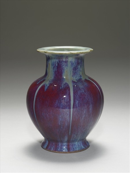 圓口折沿,折沿作六瓣花形,短直頸,碩腹下斂,撇足。通體施鈞紅釉,呈紅、靛、紫、月白等多色深淺混雜流動窯變釉,口內與折沿則多作淺月白藍色。器底施醬釉,底心印「大清乾隆年製」六字三行篆款,圈足露胎,塗赭色汁。仿鈞窯變釉為雍正時出現的新品種,係仿鈞釉色繁衍而來,採多次施釉,燒成過程中,不同金屬元素自然結合。所產生的流動窯變釉色,一般偏藍者,稱「火焰青」。