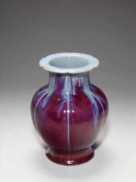 圓口折沿,折沿作六瓣花形,短直頸,碩腹下斂,撇足。通體施鈞紅釉,呈紅、靛、紫、月白等多色深淺混雜流動窯變釉,口內與折沿則多作淺月白藍色。器底施醬釉,底心印「大清乾隆年製」六字三行篆款,圈足露胎,塗赭色汁。仿鈞窯變釉為雍正時出現的新品種,係仿鈞釉色繁衍而來,採多次施釉,燒成過程中,不同金屬元素自然結合。所產生的流動窯變釉色,一般偏紅者,稱「火焰紅」。