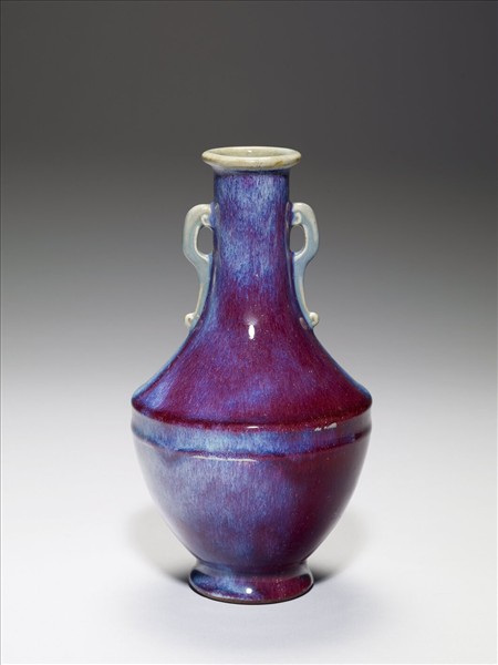 小唇口,長頸,雙耳,折肩,腹部下斂,撇足。通體施鈞紅釉,呈紅、靛、紫、月白等多色深淺混雜流動窯變釉,口內與雲形板耳則多作淺月白藍色。器底施醬釉,底心印「大清乾隆年製」六字三行篆款,圈足露胎,塗赭色汁。仿鈞窯變釉為雍正時出現的新品種,係仿鈞釉色繁衍而來,採多次施釉,燒成過程中,不同金屬元素自然結合。所產生的流動窯變釉色,一般偏藍者,稱「火焰青」。