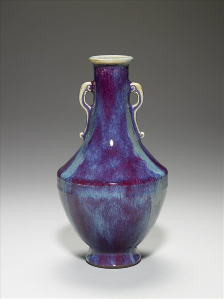 小唇口,長頸,雙耳,折肩,腹部下斂,撇足。通體施鈞紅釉,呈紅、靛、紫、月白等多色深淺混雜流動窯變釉,口內與雲形板耳則多作淺月白藍色。器底施醬釉,底心印「大清乾隆年製」六字三行篆款,圈足露胎,塗赭色汁。仿鈞窯變釉為雍正時出現的新品種,係仿鈞釉色繁衍而來,採多次施釉,燒成過程中,不同金屬元素自然結合。所產生的流動窯變釉色,一般偏藍者,稱「火焰青」。