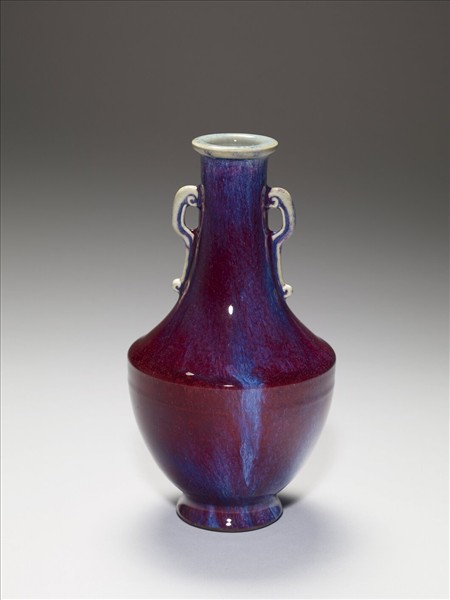 小唇口,長頸,雙耳,折肩,腹部下斂,撇足。通體施鈞紅釉,呈紅、靛、紫、月白等多色深淺混雜流動窯變釉,口內與雲形板耳則多作淺月白藍色。器底施醬釉,底心印「大清乾隆年製」六字三行篆款,圈足露胎,塗赭色汁。仿鈞窯變釉為雍正時出現的新品種,係仿鈞釉色繁衍而來,採多次施釉,燒成過程中,不同金屬元素自然結合。所產生的流動窯變釉色,一般偏紅者,稱「火焰紅」。