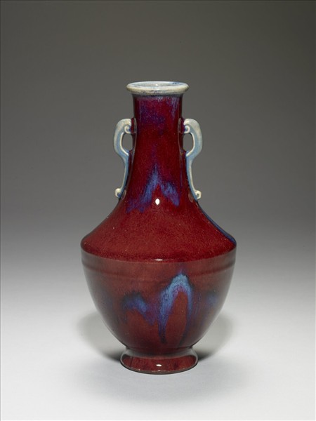 小唇口,長頸,雙耳,折肩,腹部下斂,撇足。通體施鈞紅釉,呈紅、靛、紫、月白等多色深淺混雜流動窯變釉,口內與雲形板耳則多作淺月白藍色。器底施醬釉,底心印「大清乾隆年製」六字三行篆款,圈足露胎,塗赭色汁。仿鈞窯變釉為雍正時出現的新品種,係仿鈞釉色繁衍而來,採多次施釉,燒成過程中,不同金屬元素自然結合。所產生的流動窯變釉色,一般偏紅者,稱「火焰紅」。