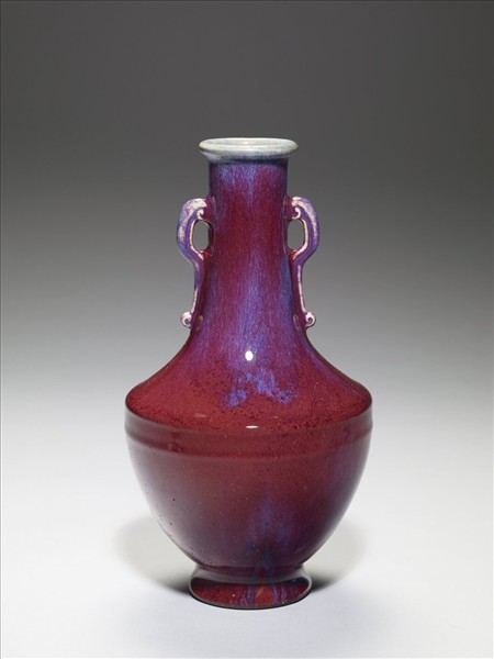 小唇口,長頸,雙耳,折肩,腹部下斂,撇足。通體施鈞紅釉,呈紅、靛、紫、月白等多色深淺混雜流動窯變釉,口內與雲形板耳則多作淺月白藍色。器底施醬釉,底心印「大清乾隆年製」六字三行篆款,圈足露胎,塗赭色汁。仿鈞窯變釉為雍正時出現的新品種,係仿鈞釉色繁衍而來,採多次施釉,燒成過程中,不同金屬元素自然結合。所產生的流動窯變釉色,一般偏紅者,稱「火焰紅」。