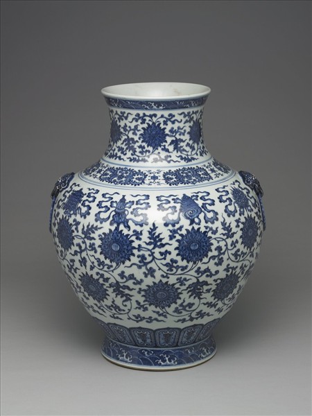 圓口外侈,短頸,豐肩,圓腹,圈足外撇,肩帶銜環鋪首雙耳。以青花為飾,口緣有波濤紋一圈,頸飾轉枝番蓮紋,肩部飾團花紋,腹壁上緣飾一圈佛教八寶,下方以兩層有壽字花心的轉枝番蓮為飾,腹部下緣繪蓮瓣紋一圈,圈足外側飾波濤紋一圈。足緣底露胎,塗褐色汁,器底以青花書「大清乾隆年製」六字三行篆款。