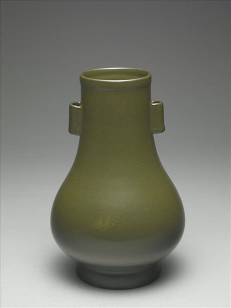 圓口,直頸,雙貫耳,斜肩,垂腹,圈足。全器施茶葉末釉,呈橄欖綠色,釉色溫潤。足底露胎,塗褐色護胎汁。底施茶葉末釉,有模印「大清乾隆年製」六字三行篆款。