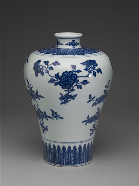 唇口,短直頸,豐肩下斂,近底處外撇,平底內凹成足。外壁以釉下青花繪折枝花卉、桃實、靈芝及蓮瓣等紋飾。