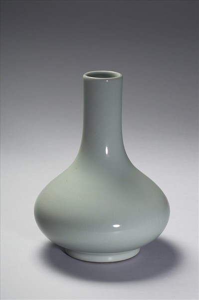 直口,長頸,溜肩,垂腹,矮圈足。全器施青瓷釉,色呈淺藍色,釉面平滑勻潤。足緣塗深褐色鐵汁,底以青花書「大清乾隆年製」六字三行篆書款。
