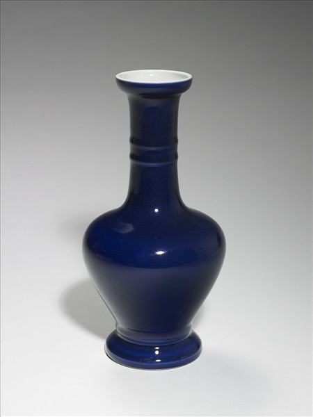 盤口上折,直長頸,斜肩,碩腹下斂,雙階式撇足。器身施霽青釉,勻淨光亮,長頸上飾弦紋二道,器內白釉。底白地青花書「大清雍正年製」雙行六字楷款,外加雙圈。
