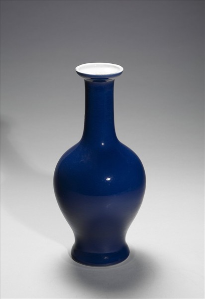 盤口上折,直長頸,斜肩,碩腹,斂脛,平底。器身施霽青釉,勻淨光亮,器內白釉。底白地青花書「大清雍正年製」雙行六字楷款,外加雙圈。