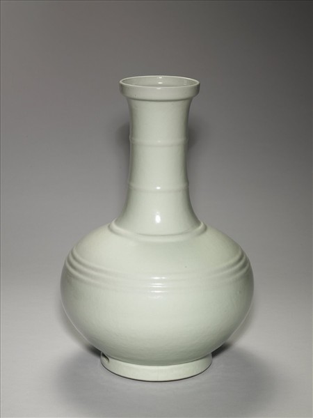 盤口,直長頸,斜肩,碩腹,圈足,足上有長方形穿孔二。通體施青釉,色灰綠光潤,頸與腹部共飾弦紋六道。圈足露胎塗棕色汁,器底青花書「大清雍正年製」三行六字篆款。