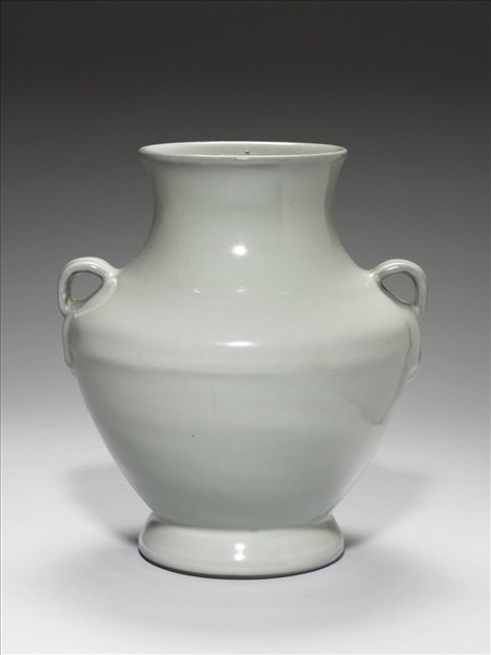 撇口,短頸,斜肩,碩腹下斂,撇足,肩帶暗環繫耳一對。通體施青釉,灰綠勻潤。圈足露胎,塗棕色汁,器底青花書「大清雍正年製」三行六字篆款。