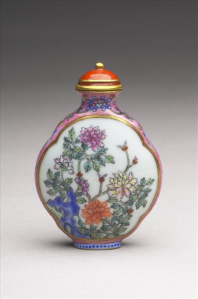 瓷質。圓口短頸,扁腹橢圓形足,前後壁成四瓣橢圓形,兩側微拱,壁一面繪菊花由石間生出,菊花姿態各異,色彩動人。器壁另一面則寫飾隸書乾隆御製詩。隙地繪飾粉紅地彩連枝花卉紋,底有「乾隆年製」四字篆款。有紅色圓頂蓋。本器一式二十件,共儲於一木匣。