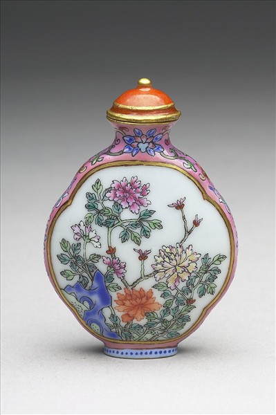 瓷質。圓口短頸,扁腹橢圓形足,前後壁成四瓣橢圓形,兩側微拱,壁一面繪菊花由石間生出,花朵姿態各異,色彩動人。器壁另一面則寫飾隸書乾隆御製詩。隙地繪飾粉紅地彩連枝花卉紋,底有「乾隆年製」四字篆款。有紅色圓頂蓋。本器一式二十件,共儲於一木匣。