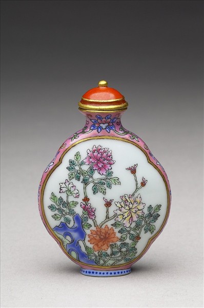瓷質。圓口短頸,扁腹橢圓形足,前後壁成四瓣橢圓形,兩側微拱,壁一面繪菊花由石間生出,花朵姿態各異,色彩動人。器壁另一面則寫飾隸書乾隆御製詩。隙地繪飾粉紅地彩連枝花卉紋,底有「乾隆年製」四字篆款。有紅色圓頂蓋。本器一式二十件,共儲於一木匣。