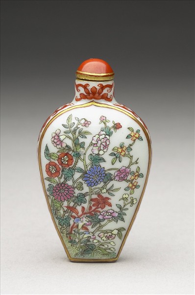 扁圓形小瓶,平口,短頸,碩腹,平底。兩面繪金線開光,內繪五彩花卉,雙面同紋,側飾白地橙紅色變形蓮紋。器底橫書「嘉慶年製」篆款。有紅釉地描金線小瓷蓋與牙匙。本器一式十件,共儲於一木匣。