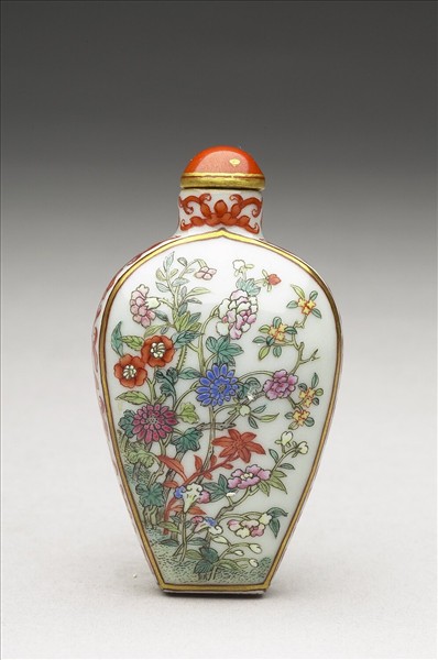 扁圓形小瓶,平口,短頸,碩腹,平底。兩面繪金線開光,內繪五彩花卉,雙面同紋,側飾白地橙紅色變形蓮紋。器底橫書「嘉慶年製」篆款。有紅釉地描金線小瓷蓋與牙匙。本器一式十件,共儲於一木匣。