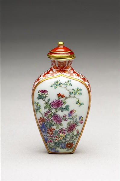 扁圓形小瓶,平口,短頸微歛,碩腹,平底。腹兩面有繪金線開光,內彩繪湖石與各種花卉,雙面同紋,其餘飾橙紅色變形蓮紋。器底橫書「嘉慶年製」篆款。有紅釉地描金線帶鈕瓷蓋,附牙匙。本器一式十件,共儲於一木匣。