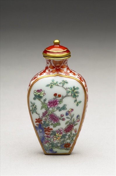 扁圓形小瓶,平口,短頸微斂,碩腹,平底。腹兩面有繪金線開光,內彩繪湖石與各種花卉,雙面同紋,其餘飾橙紅色變形蓮紋。器底橫書「嘉慶年製」篆款。有紅釉地描金線帶鈕瓷蓋,附牙匙。本器一式十件,共儲於一木匣。