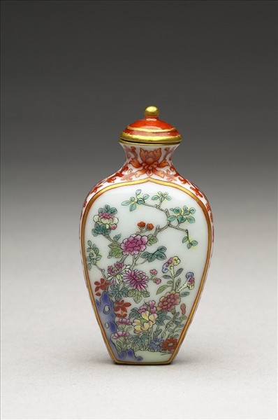 扁圓形小瓶,平口,短頸微斂,碩腹,平底。腹兩面有繪金線開光,內彩繪湖石與各種花卉,雙面同紋,其餘飾橙紅色變形蓮紋。器底橫書「嘉慶年製」篆款。有紅釉地描金線帶鈕瓷蓋,附牙匙。本器一式十件,共儲於一木匣。