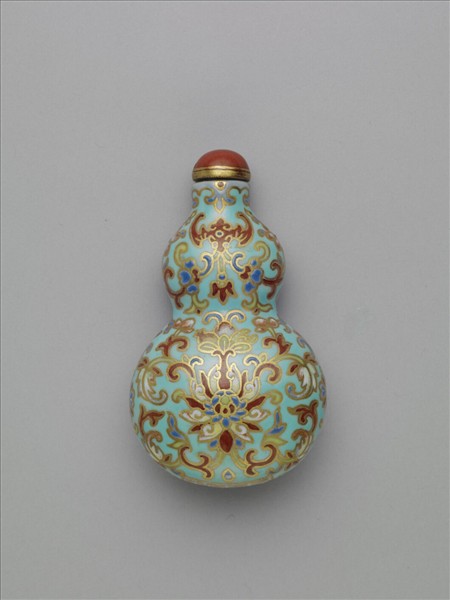 乾隆、嘉慶兩朝,常成套燒製粉彩鼻煙壺,或拾件一套、或貳拾件一套不等。此器作扁葫蘆形,平底、湖綠色為地,上腹彩繪蝙蝠銜卷枝花,下腹彩繪卷枝番蓮花,花心伸出,捧桃及石榴與佛手(稱之謂三多),器底描金篆書橫款:「嘉慶年製」四字,帶描金紅彩瓷蓋與牙匙。