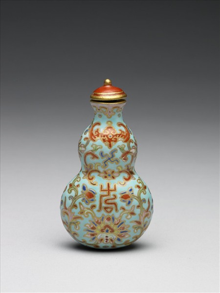 瓷質。器呈扁葫蘆形,腹部微凸。器身除口緣附近為粉紅地外,皆以湖綠為底,上繪卷草紋,以紅藍綠等色填飾,再以金色勾邊,令整器絢爛多彩而富麗堂皇,卷草紋間另繪一紅色蝙蝠與「壽」字,帶有「福壽」的吉祥意涵。底有「嘉慶年製」四字篆款。有紅色圓頂蓋。本器一式十件,同儲於一木匣。