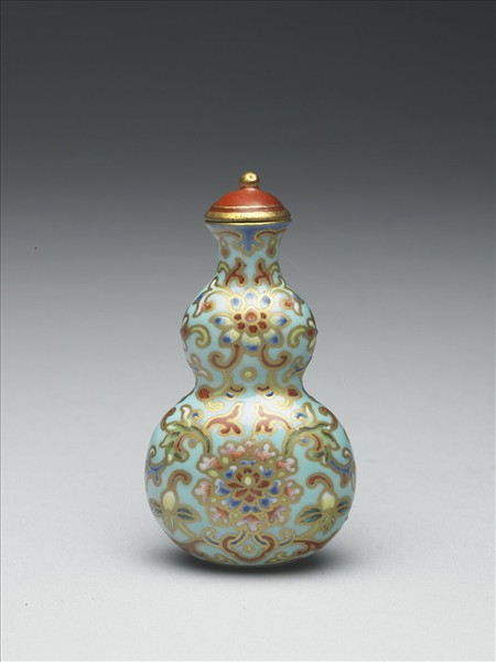 瓷質。器呈扁葫蘆形,腹部微凸。器身除口緣附近為淺藍地外,皆以湖綠為底,上繪卷草花卉紋,並以紅藍綠等色填飾,再以金色勾邊,令整器絢爛多彩而富麗堂皇,底有「嘉慶年製」四字篆款。有紅色圓頂蓋。