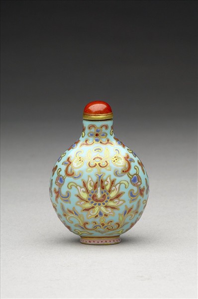 鼻煙壺,小圓口,短頸,腹圓如滿月、前後外鼓,橢圓形圈足。附紅色圓頂蓋,下接木塞、牙匙,用來舀壺裡的鼻煙,或盛在小碟上,或直接放在拇指背上,入鼻嗅用。全器施湖綠色釉為地,粉彩、描金滿畫卷枝番蓮紋,花心伸出桃實、石榴、佛手─稱作「三多」。底外有一行四字篆款「嘉慶年製」。乾隆、嘉慶年間,常成套燒製釉上彩鼻煙壺,此器為一套十件的其中一件。